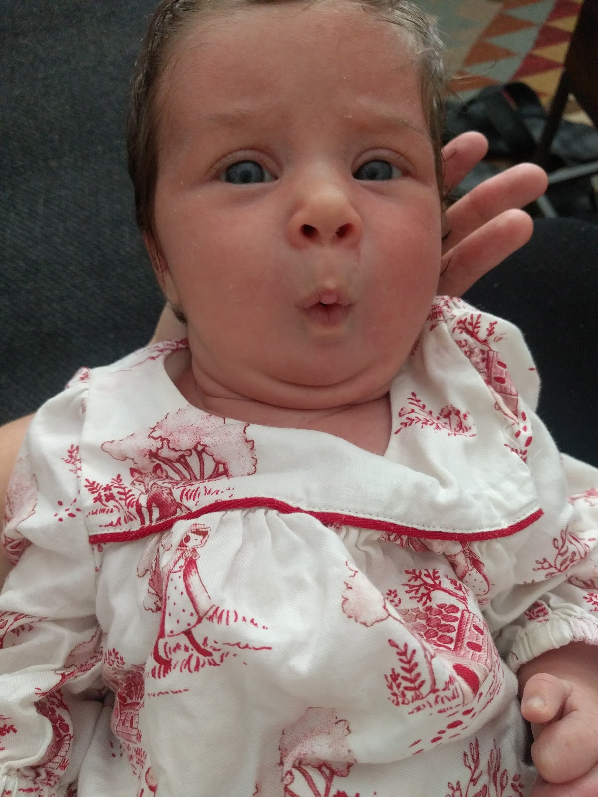 A really nice weight, at 3.58kilos, and an excellent Apgar rating. We were ecstatic. They lay her on my chest, and I got to know her while she gripped my fingers with her little hands.
